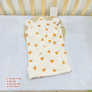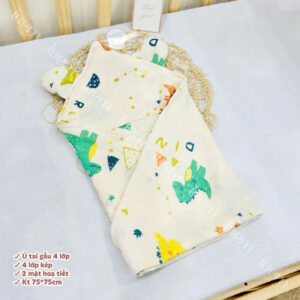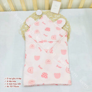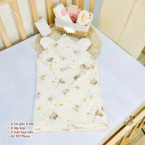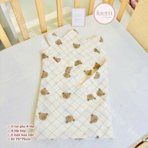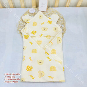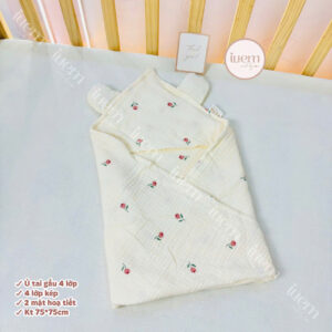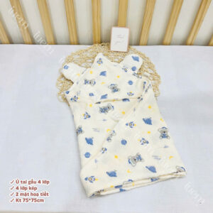 Ủ đón bé xô muslin 4 lớp iuemshop, 2 mặt hoạ tiết, may tai gấu xinh, mềm, thoáng, không bụi vải,kết hợp làm khăn tắm